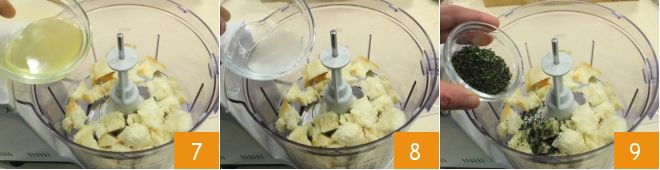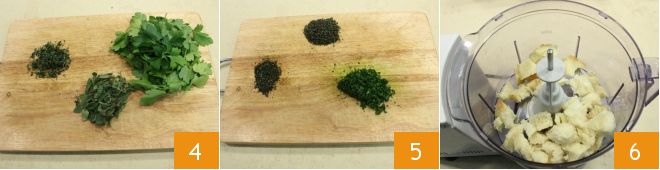 Jetzt kümmern Sie sich um das Panieren: Hacken Sie den Thymian, die Petersilie und den Majoran fein (4-5) und legen Sie die Mischung beiseite. Geben Sie das Brotinnere in den Mixer 6,