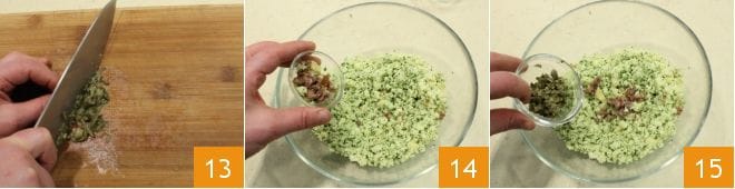 und die Kapern aus Pantelleria 13 und mischen Sie sowohl die Sardellenstückchen 14 als auch die Kaperstückchen 15 in die Panade.