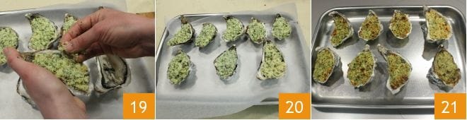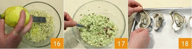 Aromatisieren Sie mit Zitronenschale 16 und mischen Sie mit einem Holzlöffel, um die Zutaten zu verbinden 17. Legen Sie ein Backblech mit Backpapier aus und um die Schalen, die sonst umkippen könnten, stabil zu halten, legen Sie unter jede Schale einen Ring aus Aluminiumfolie 18, so bleiben die Austern beim Backen aufrecht.