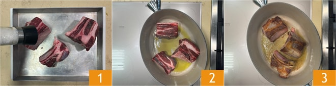 Um die Paccheri mit Rippchen auf genuesische Art zuzubereiten, beginnen Sie damit, das Fleisch großzügig zu salzen 1, dann braten Sie es in nativem Olivenöl in einem großen Topf an 2 3.