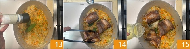 Würzen Sie mit Salz 13 und schwarzem Pfeffer und lassen Sie alles bei niedriger Hitze etwa 10 Minuten köcheln, wobei Sie einen Deckel aufsetzen, um das Garen der Zwiebeln zu begünstigen. Sobald sie fertig sind, geben Sie das Fleisch zurück in die Pfanne 14 und löschen Sie mit Weißwein ab 15.