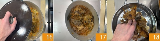 Die zerkleinerten Fleischstücke zur Zwiebelsauce geben 19, umrühren, um sie zu aromatisieren 20, und den Lorbeer entfernen 21.
