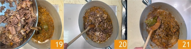 Das Ganze etwa 4-5 Stunden bei sehr niedriger Hitze mit Deckel köcheln lassen, bis das Fleisch zart wird und beginnt, sich vom Knochen zu lösen 17. An diesem Punkt das Fleisch aus dem Topf nehmen und zerkleinern 18, dann die Würze nach Ihrem Geschmack anpassen.