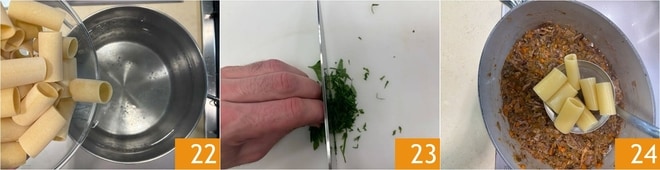 In der Zwischenzeit die Paccheri in reichlich gesalzenem Wasser nach der auf der Packung angegebenen Zeit kochen 22. In der Zwischenzeit Majoran, Petersilie und Schnittlauch hacken 23. Die Paccheri einige Minuten vor Ende der Garzeit abgießen und zur Sauce geben 24.