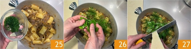 Mit den gehackten Kräutern würzen 25 und das Basilikum mit den Händen zerpflücken 26. Mit geriebenem Parmigiano Reggiano DOP bestreuen 27.