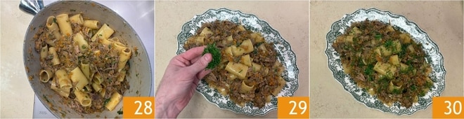 Umrühren, um alles zu vermischen 28, und servieren Sie Ihre Paccheri mit Rippchen auf genuesische Art sofort, indem Sie nach Belieben weitere aromatische Kräuter hinzufügen 29 30!