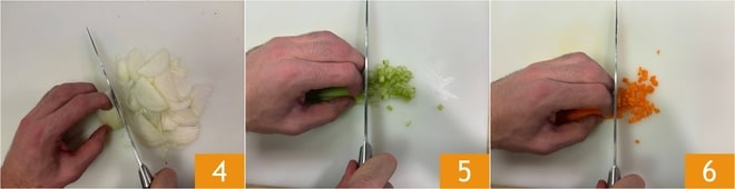 Während das Fleisch kocht, schälen und schneiden Sie die Zwiebeln in Scheiben 4, dann putzen und würfeln Sie den Sellerie 5 und die Karotten 6.