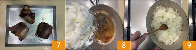Wenn das Fleisch gut karamellisiert ist, nehmen Sie es aus der Pfanne und stellen es beiseite 7. In derselben Pfanne fügen Sie die Zwiebeln hinzu 8 und lassen Sie sie für einen Moment anbraten 9.