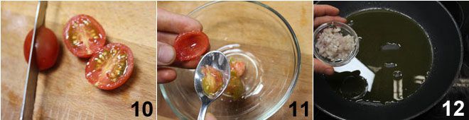 In der Zwischenzeit vierteln Sie die Kirschtomaten 10 und entfernen die Samen 11. Hacken Sie die Frühlingszwiebel und lassen Sie sie mit ein paar Esslöffeln Olivenöl anschwitzen 12,