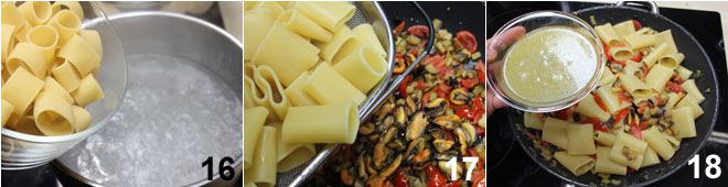 bringen Sie dann einen Topf mit Salzwasser zum Kochen und kochen Sie die Paccheri 16. Lassen Sie sie al dente abtropfen und fügen Sie sie der Sauce hinzu 17, dann geben Sie das zuvor aufgehobene Kochwasser der Miesmuscheln dazu 18.