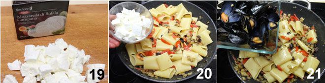 Schneiden Sie den Büffelmozzarella in Stücke 19 und fügen Sie ihn der Pasta hinzu 20, dann geben Sie die restlichen Miesmuscheln mit Schale und reichlich Petersilie hinzu 21. Mischen Sie alle Zutaten gut durch und Sie sind bereit, Ihre Paccheri mit Auberginen, Miesmuscheln und Büffelmozzarella zu servieren.
