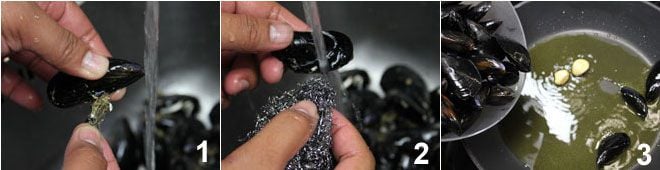 Um die Paccheri mit Auberginen, Miesmuscheln und Büffelmozzarella zuzubereiten, beginnen Sie damit, die Miesmuscheln gründlich zu reinigen. Entfernen Sie die herausragenden Bärte 1, kratzen Sie die Schalen ab und waschen Sie sie gründlich unter fließendem Wasser, um alle Verunreinigungen zu entfernen 2 (für weitere Details zur Reinigung von Miesmuscheln Wie man Miesmuscheln reinigt und öffnet). Sobald die Miesmuscheln gereinigt sind, legen Sie sie in eine Pfanne mit zwei Esslöffeln Öl und zwei Knoblauchzehen und lassen Sie sie aufgehen 3.