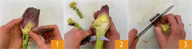 Um die Paccheri mit Artischocken, Venusmuscheln und Bottarga zuzubereiten, lassen Sie zuerst die Venusmuscheln ein paar Stunden in einer Schüssel mit Salzwasser ausspülen. Gehen Sie zur Wie man Artischocken putzt über: Entfernen Sie die äußeren, härteren Blätter 1, schälen Sie dann den Stiel mit einem kleinen Messer 2 und schneiden Sie die Spitzen ab 3.