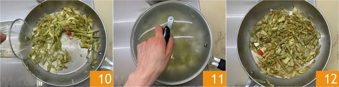 Löschen Sie mit Weißwein ab 10 und lassen Sie ihn vollständig verdampfen, reduzieren Sie dann die Hitze und kochen Sie mit Deckel für etwa zehn Minuten 11. Sobald die Artischocken gar sind, stellen Sie den Herd aus 12, entfernen Sie Knoblauch und Chilischote und legen Sie sie beiseite.