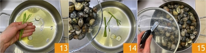 Während die Artischocken kochen, kümmern Sie sich um die Venusmuscheln: Lassen Sie in einer anderen Pfanne etwas Öl mit einer Knoblauchzehe und den Petersilienstängeln 13 aromatisieren, fügen Sie dann die aus dem Einweichwasser abgetropften Venusmuscheln hinzu 14. Decken Sie mit dem Deckel ab 15 und kochen Sie bei starker Hitze, nur solange bis die Schalen sich öffnen.