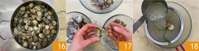 Entfernen Sie die Venusmuscheln, sobald sie sich öffnen, aus der Pfanne 16. Schälen Sie fast alle Muscheln, lassen Sie aber einige zur Dekoration ganz 17. Filtern Sie die Kochflüssigkeit der Venusmuscheln 18 und legen Sie sie beiseite.