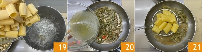 Bringen Sie in der Zwischenzeit einen Topf mit Salzwasser zum Kochen und kochen Sie die Paccheri al dente 19. Gießen Sie die Kochflüssigkeit der Venusmuscheln in die Pfanne mit den Artischocken 20, dann geben Sie auch die Paccheri dazu 21. Mischen Sie und beenden Sie das Kochen der Pasta, indem Sie bei Bedarf wenig Kochwasser hinzugeben.