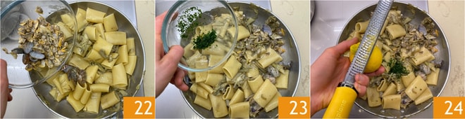 Zum Schluss fügen Sie die geschälten Venusmuscheln hinzu 22 und braten Sie alles nochmal an. Stellen Sie den Herd aus und aromatisieren Sie mit gehacktem Petersilie 23 und geriebener Zitronenschale 24.