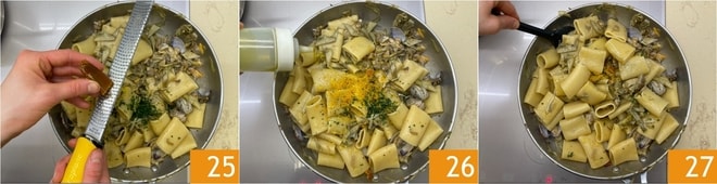 Würzen Sie mit geriebener Bottarga 25 und vermengen Sie mit einem Schuss Öl 26, dann gut mischen 27.