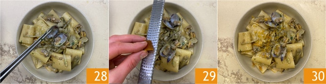 Richten Sie an und garnieren Sie mit den beiseitegelegten ganzen Venusmuscheln 28, dann vervollständigen Sie mit noch ein wenig geriebener Bottarga 29. Ihre Paccheri mit Artischocken, Venusmuscheln und Bottarga sind bereit zum Servieren 30!