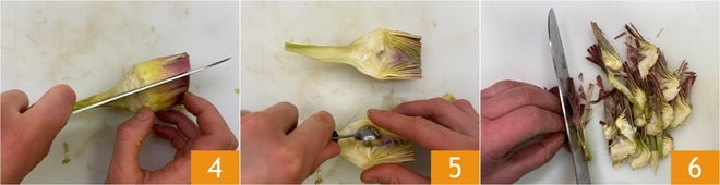 Teilen Sie die Artischocken längs in Hälften 4, entfernen Sie dann das „Bartinnere“ 5 und schneiden Sie sie in dünne Scheiben 6. Tauchen Sie die gereinigten Artischocken nach und nach in eine Schüssel mit säurehaltigem Wasser, um zu verhindern, dass sie sich verfärben.
