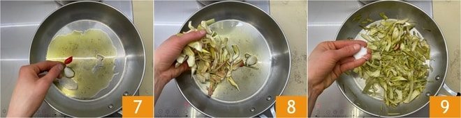 Erhitzen Sie in einer Pfanne etwas Öl zusammen mit einer Knoblauchzehe und der Chilischote 7, geben Sie dann die abgetropften Artischocken hinzu 8, salzen Sie 9 und braten Sie alles ein paar Minuten bei mittlerer Hitze an.