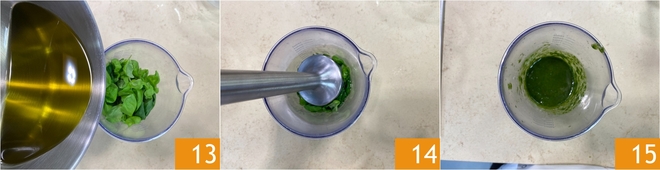 Gießen Sie das heiße Öl über die frischen Basilikumblätter im Mixerglas 13, dann pürieren Sie es mit dem Stabmixer 14, bis ein grünes und duftendes Öl entsteht 15.<\/p>