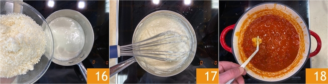 Nun zum Parmesanfondue: Erhitzen Sie die Sahne in einem kleinen Topf, ohne sie zum Kochen zu bringen, und rühren Sie nach und nach den geriebenen Parmigiano Reggiano ein 16, rühren Sie mit einem Schneebesen 17, bis eine glatte und samtige Creme entsteht. Halten Sie es warm. Wenn die Sauce fertig ist, entfernen Sie die Knoblauchzehe 18.<\/p>