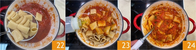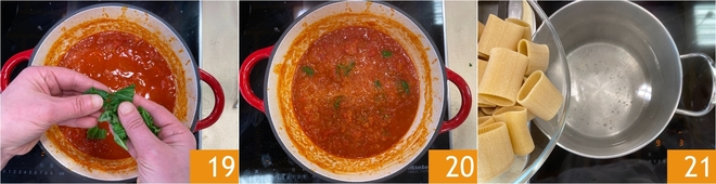 Duften Sie mit frisch zerrissenem Basilikum direkt mit den Händen 19; umrühren und noch einen Moment ziehen lassen 20. Bringen Sie reichlich Salzwasser zum Kochen und kochen Sie die Paccheri 21, bis sie al dente sind.<\/p>