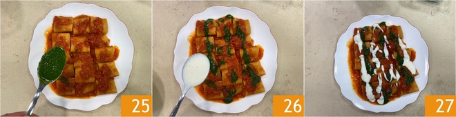 Servieren Sie, indem Sie die Paccheri auf den Teller legen, mit ein paar Löffeln Basilikumöl abschließen 25 und schließlich mit dem Parmesanfondue garnieren 26. Sofort die heißen Paccheri mit falscher Sauce servieren 27!<\/p>