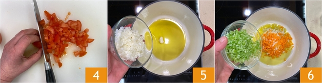 Schneiden Sie dann die frischen Tomaten in Stücke 4. In einem großen Topf erhitzen Sie das native Olivenöl extra und fügen Sie eine zerdrückte Knoblauchzehe hinzu, danach die gehackte Zwiebel 5, die Karotte und den Sellerie 6 und lassen Sie sie bei niedriger Hitze anbraten, bis das Gemüse weich und glänzend ist.<\/p>