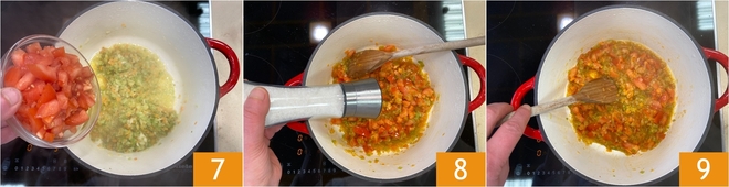 Fügen Sie die in Stücke geschnittenen frischen Tomaten 7 hinzu und lassen Sie sie weich werden, dann mit Salz 8 und Pfeffer würzen. Gut umrühren, bis der Boden gut vermischt ist 9.<\/p>