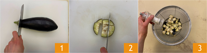 Um die Paccheri mit gebratener Auberginencreme zuzubereiten, die Aubergine waschen und das Stielende abschneiden 1, dann in Scheiben von etwa 1 cm Dicke schneiden und schließlich in Würfel schneiden 2. Die Würfel in ein Sieb geben und leicht salzen 3. Etwa 30 Minuten abtropfen lassen, so werden sie trockener und nehmen beim Frittieren nicht zu viel Öl auf.<\/p>
