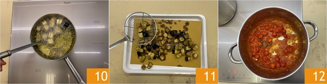 Mit Pfeffer und frischem Basilikum würzen 7 und 5 Minuten köcheln lassen; die Sauce beiseitestellen. Die Auberginen zurücknehmen und sie leicht mit den Händen ausdrücken 8. In einem Topf das Pflanzenöl auf ca. 170 b0C erhitzen, dann die Auberginen hineingeben 9.<\/p>