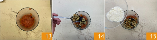 Die Sauce in einen Messbecher geben 13, ein paar Esslöffel Auberginen hinzufügen 14 und den geriebenen Grana Padano DOP dazugeben 15.<\/p>
