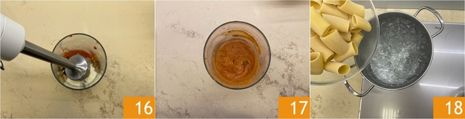 Alles mit dem Stabmixer pürieren 16, bis eine homogene Creme entsteht 17. Die Paccheri in reichlich Salzwasser kochen 18.<\/p>