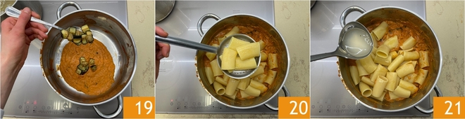 Die Auberginencreme zusammen mit den Auberginenwürfeln im Topf erwärmen 19, dann die Paccheri al dente abgießen und dazugeben 20 und einen Schöpflöffel Nudelwasser hinzufügen, um die Garstufe zu vollenden 21.<\/p>