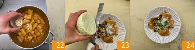 Mit den Pinienkernen vollenden 22 und umrühren. Auf Tellern anrichten, mit etwas geriebener Ricotta Salata bestreuen 23 und mit frischen Basilikumblättchen garnieren. Die Pasta mit gebratener Auberginencreme ist servierbereit 24!<\/p>