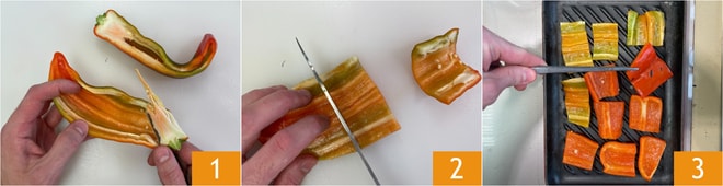 Um die Paccheri mit gegrillter Paprikacreme und Ricotta zuzubereiten, beginnen Sie mit der Reinigung der Paprika: Entfernen Sie den Stiel, die Samen und die inneren Fasern 1, und schneiden Sie sie dann in Stücke 2. Grillen Sie sie von beiden Seiten, bis sie weich und die Haut gut gebräunt ist 3; das dauert etwa 3 Minuten pro Seite. Beiseite legen.