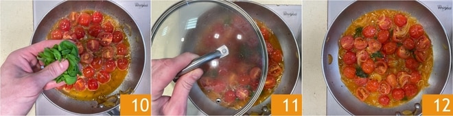 Würzen Sie mit einigen Basilikumblättern 10, decken Sie mit einem Deckel ab 11 und kochen Sie bei mittlerer Hitze etwa 20 Minuten lang, gelegentlich umrühren 12.
