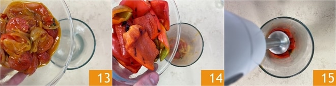 Geben Sie sowohl die Tomaten 13 als auch die Paprika in ein Gefäß 14 und pürieren Sie mit einem Stabmixer, bis eine glatte und homogene Sauce entsteht 15. Beiseite legen.