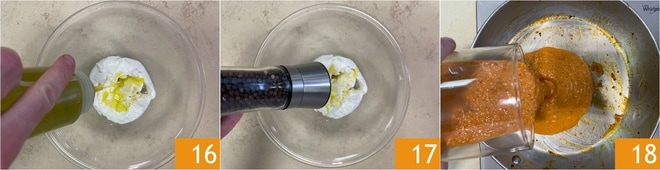 Geben Sie die Ricotta in eine Schüssel, dann würzen Sie mit etwas Öl 16, Salz und Pfeffer 17. Gut mischen, um die Zutaten zu verbinden. Nun geben Sie die Paprikacreme in die gleiche Pfanne, in der Sie die Tomaten gekocht haben, und halten Sie sie warm 18.