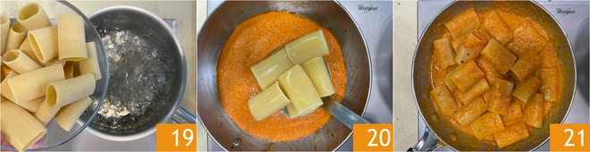 Bringen Sie einen Topf mit gesalzenem Wasser zum Kochen und kochen Sie die Paccheri al dente 19, dann lassen Sie sie direkt in der Pfanne abtropfen 20. Kurz alles vermengen, um die Pasta mit der Sauce zu verbinden 22.