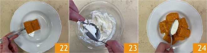 Richten Sie die Paccheri an 22. Formen Sie mit Hilfe von 2 Esslöffeln Ricotta-Quenelles 23 und legen Sie sie auf die Pasta 24.