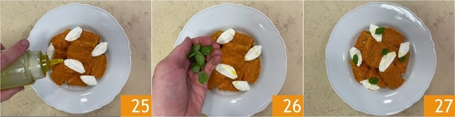Vervollständigen Sie das Gericht mit etwas rohem Öl 25 und ein paar frischen Basilikumblättern 26. Ihre Paccheri mit gegrillter Paprikacreme und Ricotta sind servierfertig 27!