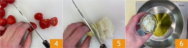 Schneiden Sie die Kirschtomaten in Hälften 4 und die Zwiebel in feine Scheiben 5. Erhitzen Sie in einer Pfanne etwas Öl, fügen Sie die Zwiebeln hinzu 6 und braten Sie sie bei mittlerer Hitze etwa 2 Minuten lang an, bis sie glasig sind.