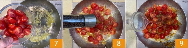 Fügen Sie die Kirschtomaten hinzu 7 und würzen Sie mit Salz und Pfeffer 8, dann gießen Sie das Wasser hinzu 9.