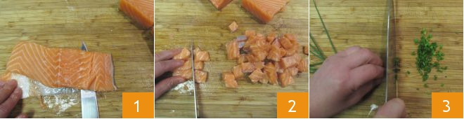 Um die Paccheri mit Lachs zuzubereiten, bringen Sie zuerst einen Topf mit reichlich Wasser zum Kochen, um die Pasta zu kochen. Entfernen Sie in der Zwischenzeit die Haut vom Lachs 1 und schneiden Sie ihn in Würfel von etwa 1-2 cm 2. Schneiden Sie den Schnittlauch fein 3.