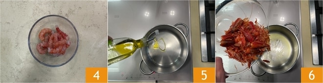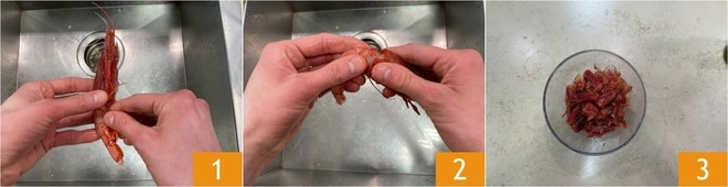 Um die Paccheri mit Provola und Garnelen zuzubereiten, kümmern Sie sich zunächst um die Reinigung der roten Garnelen. Helfen Sie sich mit den Händen, um vorsichtig die Beine abzutrennen 1 und entfernen Sie den Panzer. Dann drücken Sie leicht und lösen Sie den Kopf 2. Beim sanften Ziehen sollte auch der Darm herauskommen, falls nicht, können Sie den schwarzen Faden mit einem Zahnstocher entfernen. Sammeln Sie alle Panzer und Köpfe der Garnelen in einer Schüssel 3.