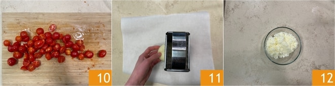 In der Zwischenzeit waschen Sie die Kirschtomaten und halbieren Sie sie 10. Reiben Sie auch den geräucherten Scamorza 11 und stellen Sie ihn beiseite 12.